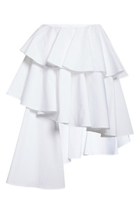 The spiral silhouettes seen throughout the label's W/S '25 runway are translated into this asymmetric skirt, which playfully sways with a continuous cotton ruffle twisting around the body. 19" to 29 1/2" length (size 36 FR) Hidden side-zip closure Lined 100% cotton Dry clean Made in Italy Designer Clothing
