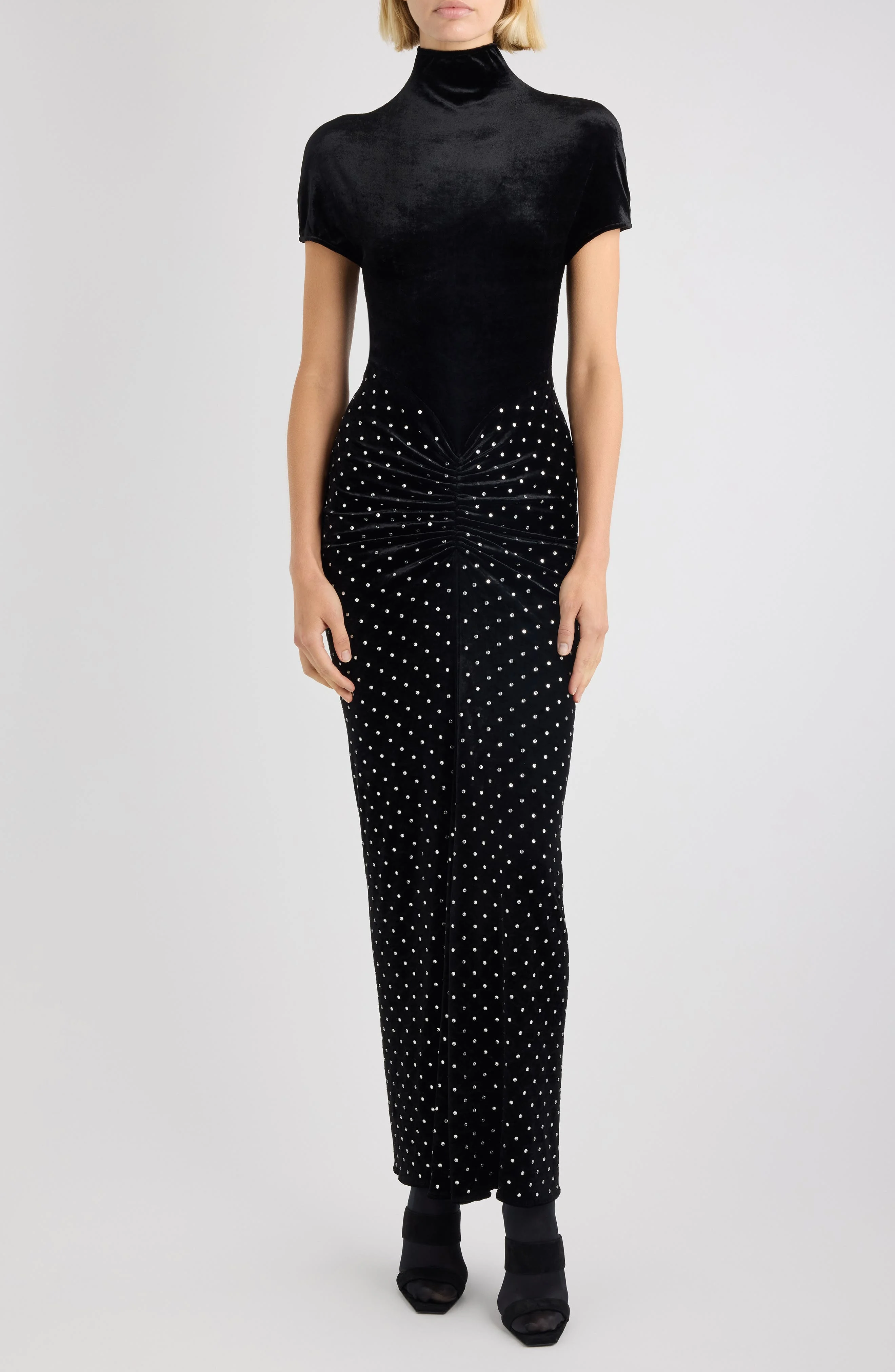 Pieter Mulier trades architectural edge for sculptural draping in this crystal-sparkled dress that honors the King of Cling's legacy as it skims your shape in plush, ultraluxe velvet, with curve-contouring ruching that flows into a columnar skirt. Hidden back-zip closure Funnel neck Short sleeves 77% viscose, 21% polyamide, 2% elastane Dry clean Made in Italy Designer Clothing