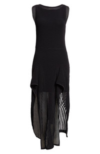 Pieter Mulier honors the King of Cling's legacy with this sculptural dress that conceals and reveals to alluring effect as it contours to your curves in peekaboo ladder-stitching before giving way to dramatic godet hem. Slips on over head Slip lining Bateau neck Sleeveless 65% cotton, 35% polyamide Dry clean Made in Italy Designer Clothing