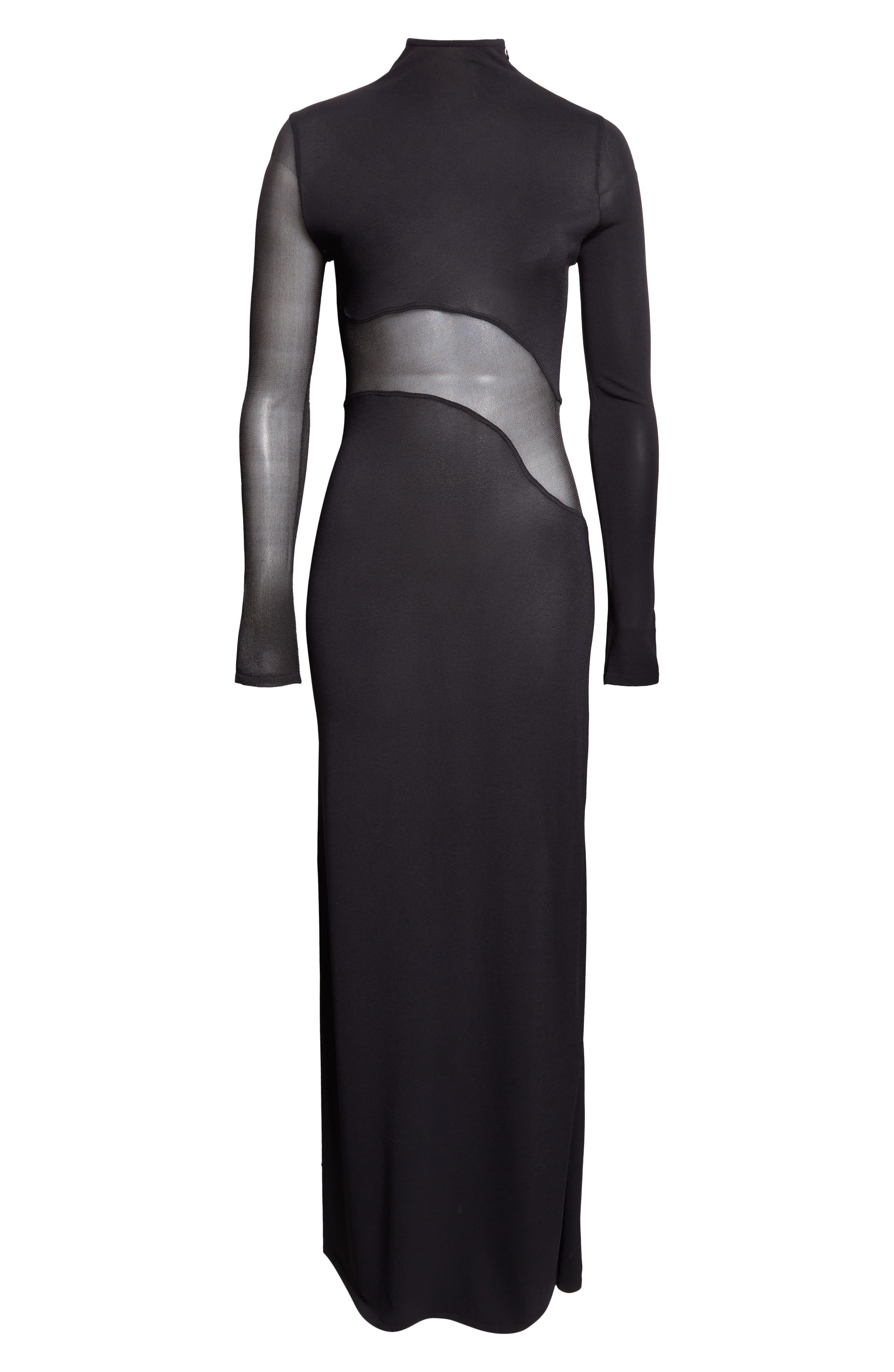 Pieter Mulier honors the King of Cling's legacy with this curve-contouring dress that conceals and reveals to alluring effect in contrasting panels of opaque jersey and sheer mesh. Hidden side-zip closure Funnel neck Long sleeves 94% viscose, 6% elastane Dry clean Made in Italy Designer Clothing