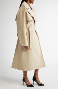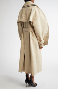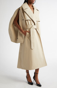 The classic trench gets a major modern overhaul in this below-the-knee version, given dramatic flair thanks to its voluminous cocoon-like sleeves and layered lapels. A removable belt cinches the waist, and a deep back slit offers ease of movement for a confident stride. Open front Notched lapels Belted cuffs Front welt pockets Removable belt Gun flap Storm flap Back slit Lined 100% cotton Dry clean Made in Italy Designer Clothing