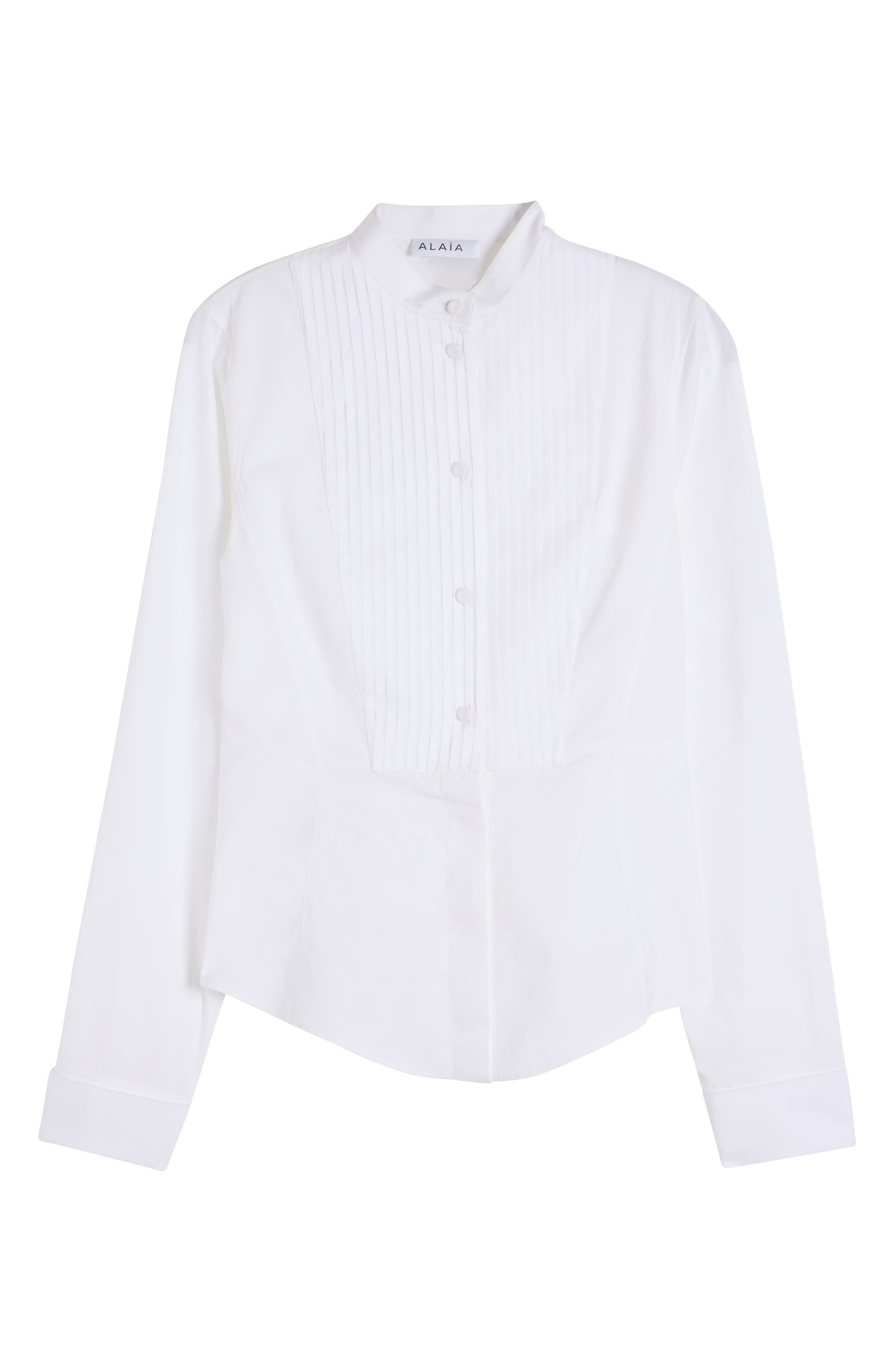 Crisp pintucks texture the bib, while a wavy peplum flares the back of this cotton poplin shirt inspired by formal wear. A fitted band collar, French cuffs and smooth covered buttons further the polished effect. Front button closure Band collar Long sleeves with French cuffs 100% cotton Dry clean Made in Italy Designer Clothing