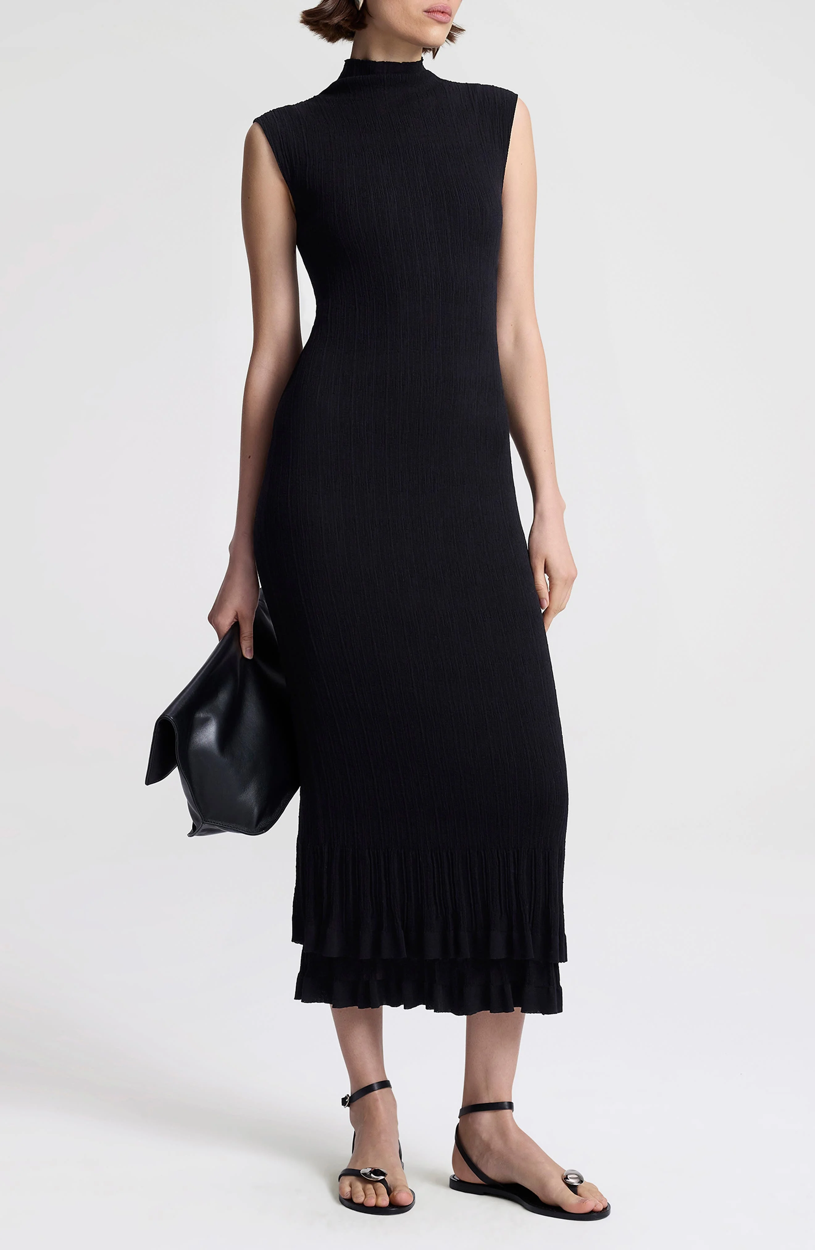 Subtly crinkled fabric adds a hint of texture to this refined sleeveless dress complete with a tiered ruffle hemline. Slips on over head Funnel neck Sleeveless Unlined 78% cotton, 22% polyamide Dry clean Imported