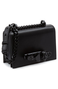 Knuckle-ring hardware with a Swarovski crystal-encrusted skull provides an edgy carrying option for this Italian-crafted leather bag. For more styling versatility, the pull-through chain strap can be worn doubled or extended as you prefer. Magnetic-snap flap closure Knuckle carry handle; adjustable pull-through chain-and-leather strap Interior card slot Structured silhouette with level base for stability Leather lining Leather Made in Italy Designer Handbags