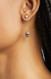Alexander McQueen's signature skulls are illuminated with twinkling crystals on drop earrings that look both slightly spooky and sparkly-spectacular. 1 1/2" drop; 1/4" width Post back Goldtone plate/Swarovski crystal Made in Italy