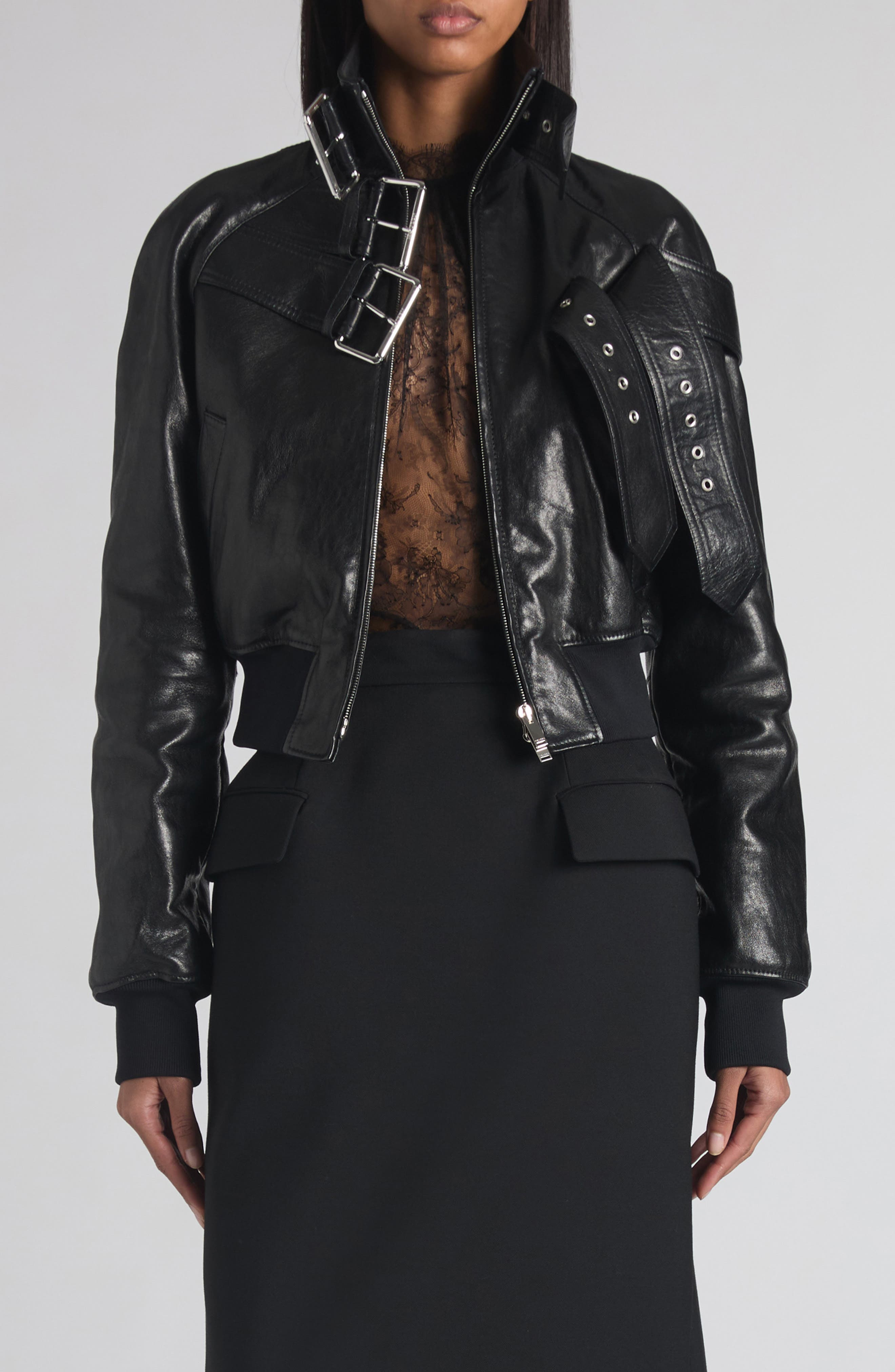 A runway-featured cropped bomber jacket is from the label's fall '25 collection, inspired in large part by Charles Dickens's 'Night Walks' about an insomniac who wanders the streets of Victorian London. The street-cool reputation of the leather bomber jacket is tinged with allusions to illusionist Harry Houdini, Bedlam and the culturally enforced restraint of the era via a trio of attached belts that detail the style. Two-way front-zip closure Stand collar Side welt pockets Three attached belts Ribbed cuffs and hem Leather Professional leather clean Made in Italy Designer Clothing