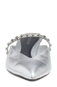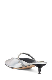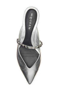 Shiny studs—a McQueen signature—punctuate the slender strap of a pointy-toe mule fashioned in Italy from silvery calfskin. 2" (50mm) heel Leather upper, lining and sole Made in Italy Designer Shoes