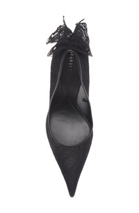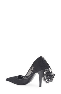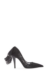 Eyelash-trimmed lace cascading past the counter creates captivating movement as you walk in this Italian-made pump sharpened with a dramatic pointy toe. 4" (102mm) heel Textile and leather upper and lining/leather sole Made in Italy Designer Shoes