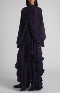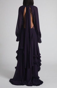 Sean McGirr gives new life to Victorian frills in his gothic-coded fall '25 outing, where this floor-pooling gown first debuted on the runway. Fashioned from Italian-silk georgette, this dress serves romance and drama in equal measure, with cascading ruffles, artful draping and sheer panels that reveal sultry flashes of skin. An open back ensures your exit is equally as memorable as your entrance. Hidden back-zip closure Mock neck Long sleeves 100% silk Dry clean Made in Italy Designer Clothing