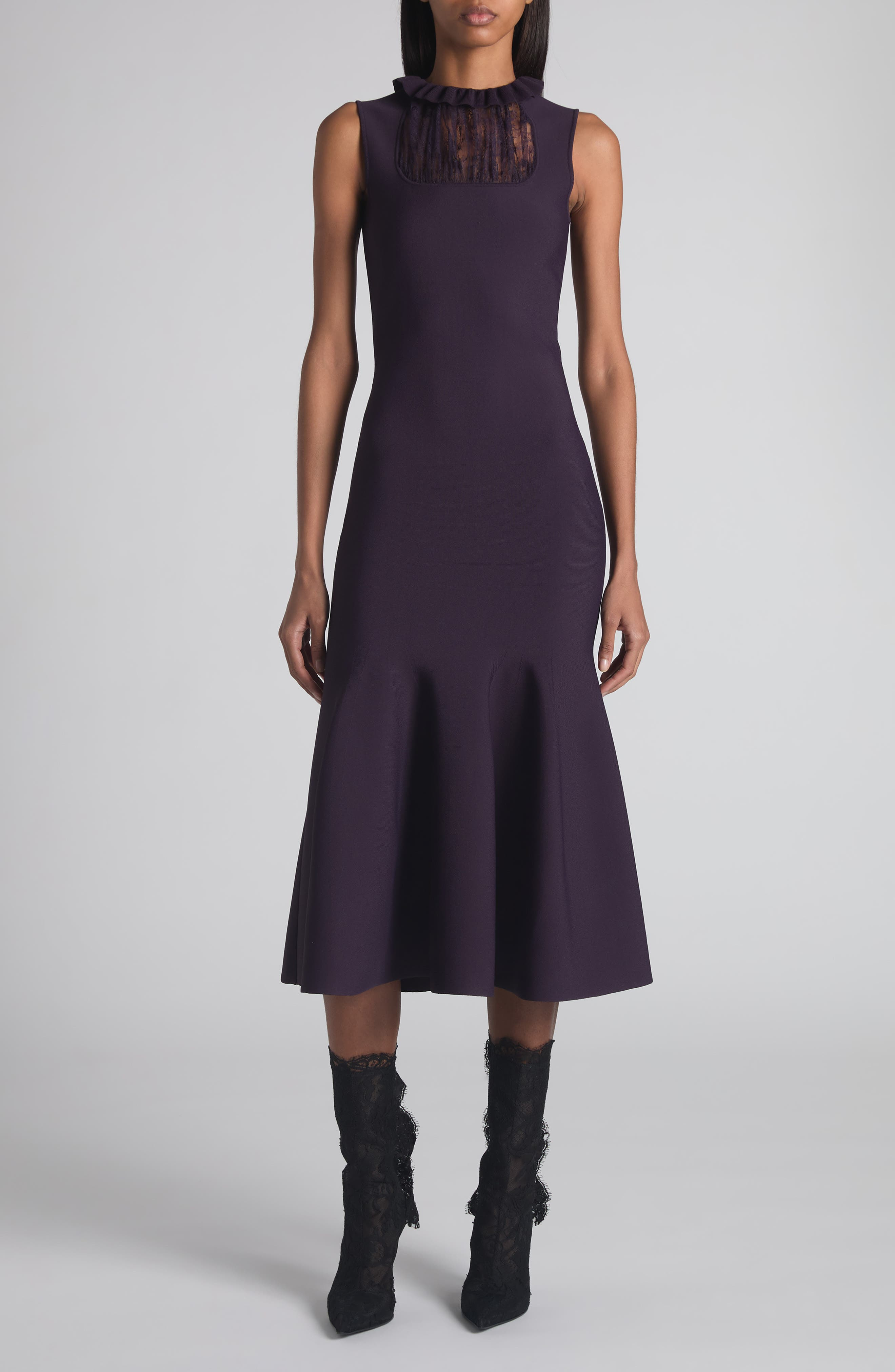 In true McQueen tradition, Sean McGirr marries gothic romance and Victorian glamour to alluring effect in this trumpet-flared midi dress designed with a tightly ruffled collar and an artfully shirred floral lace paneled at the chest. Hidden back-zip closure Jewel neck Sleeveless 66% viscose, 20% polyamide, 13% polyester, 1% elastane Dry clean Made in Italy Designer Clothing
