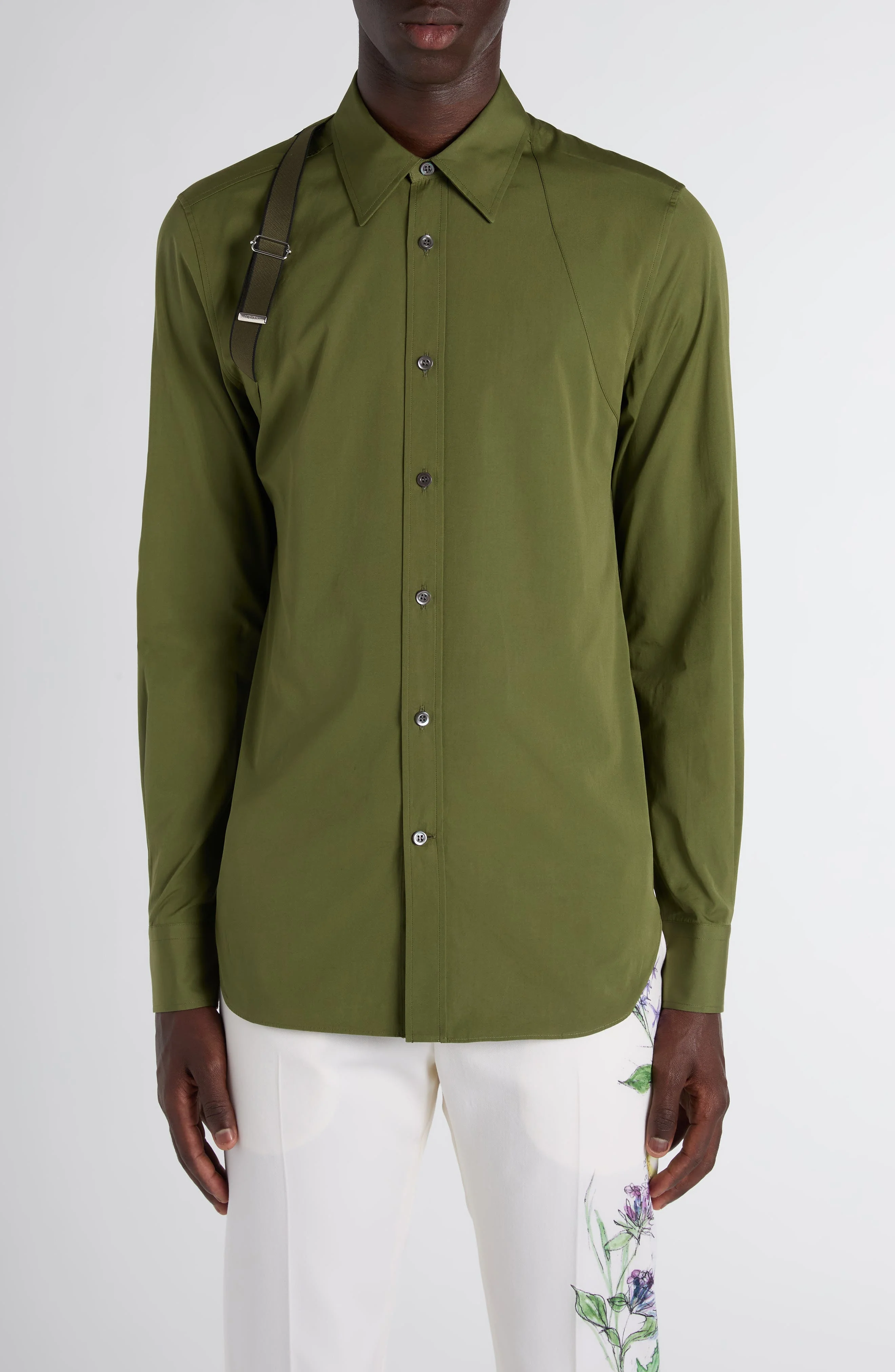 McQueen Logo Tape Harness Stretch Cotton Button-Up Shirt in Military Green at Nordstrom