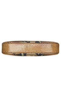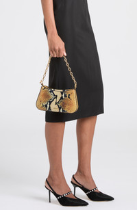 The label's signature logo-engraved T-bar hardware anchors the chunky chain strap of this python-print leather bag designed in a pouch-inspired silhouette. Top zip closure Top carry handle Interior card slot Leather Made in Italy Designer Handbags