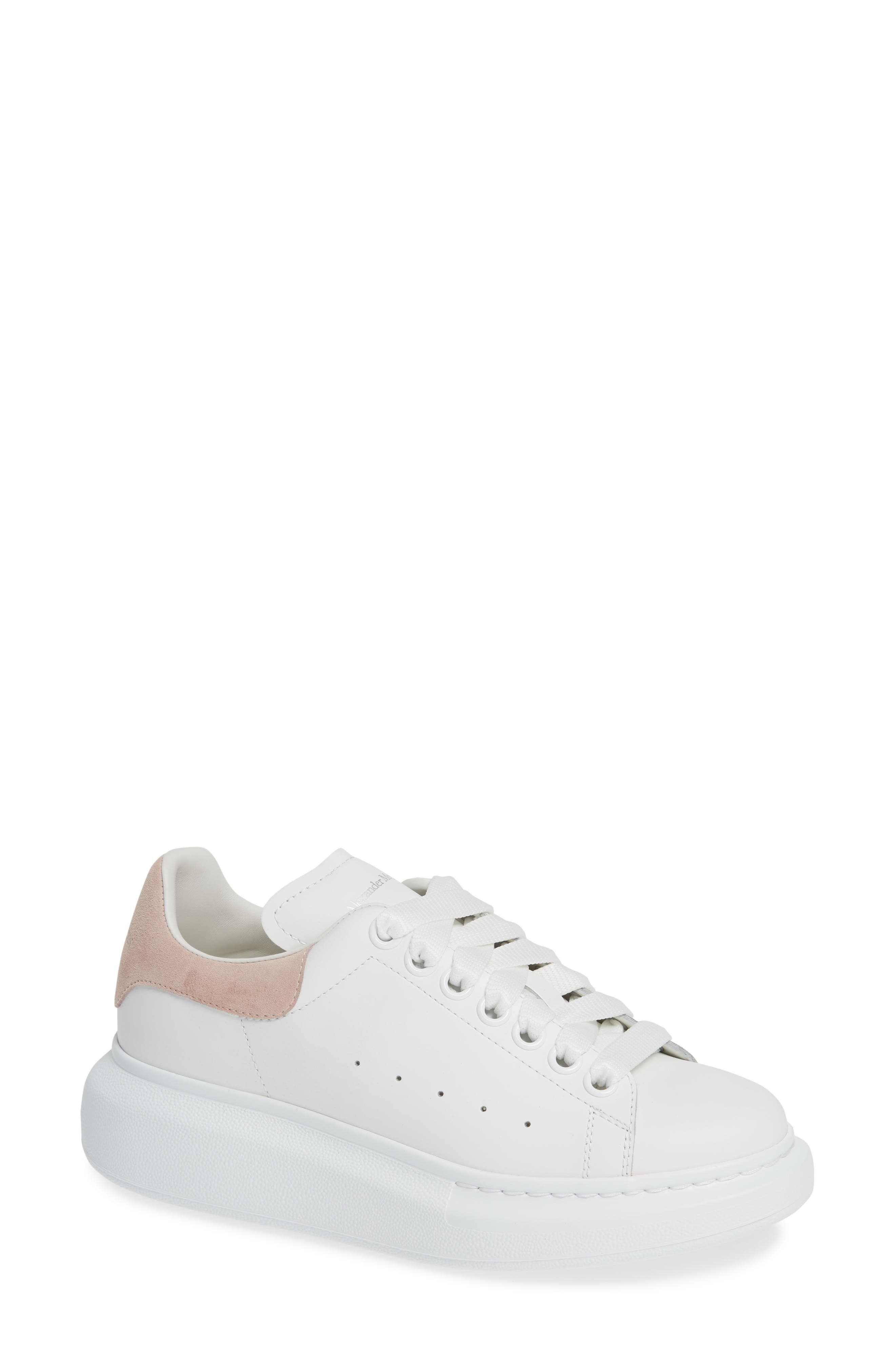 A tall rubber platform lofts a lace-up sneaker from Alexander McQueen, with a removable, padded insole that provides signature comfort. 2" (51mm) heel; 1" platform (size 38.5) Comes pre-laced; includes a second pair of white laces Lace-up style Removable insole Leather or textile upper/leather or faux-fur lining/rubber sole Made in Italy Designer Shoes