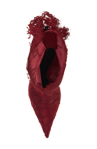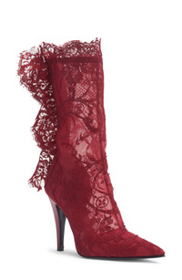 Sheer eyelash lace creates an aura of alluring intrigue on a ruffle-skimmed boot framed with a dramatic pointy toe and tastefully tapered heel. 4 1/4" (105mm) heel Back zip closure Textile upper and lining/leather sole Made in Italy Designer Shoes