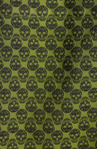 Alexander Mcqueen gives the classic camp shirt a signature after-hours gothic edge with black satin patterned in skull jacquard. 29" front length; 31 1/2" back length; 53" chest (size 17) French placket Camp collar Elbow-length sleeves Chest patch pocket 78% viscose, 22% polyester Dry clean Imported Designer Clothing