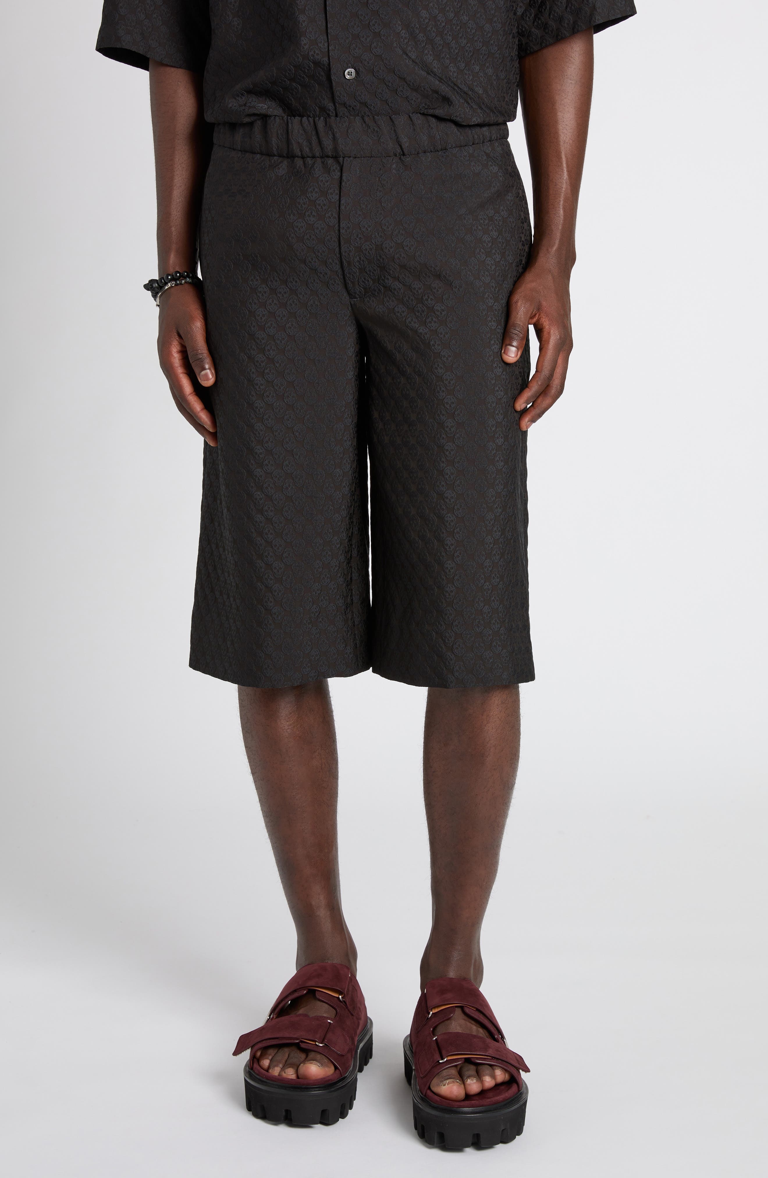 Alexander Mcqueen gives classic pull-on shorts a signature after-hours gothic edge with black satin patterned in skull jacquard. Elastic waist Side-seam pockets; back welt pockets 78% viscose, 22% polyester Dry clean Made in Italy Designer Clothing