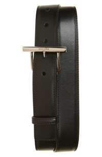 A signature T-Bar buckle is engraved with the McQueen logo on a slender belt crafted from smooth Italian calfskin. 1 1/4" belt width Leather Made in Italy