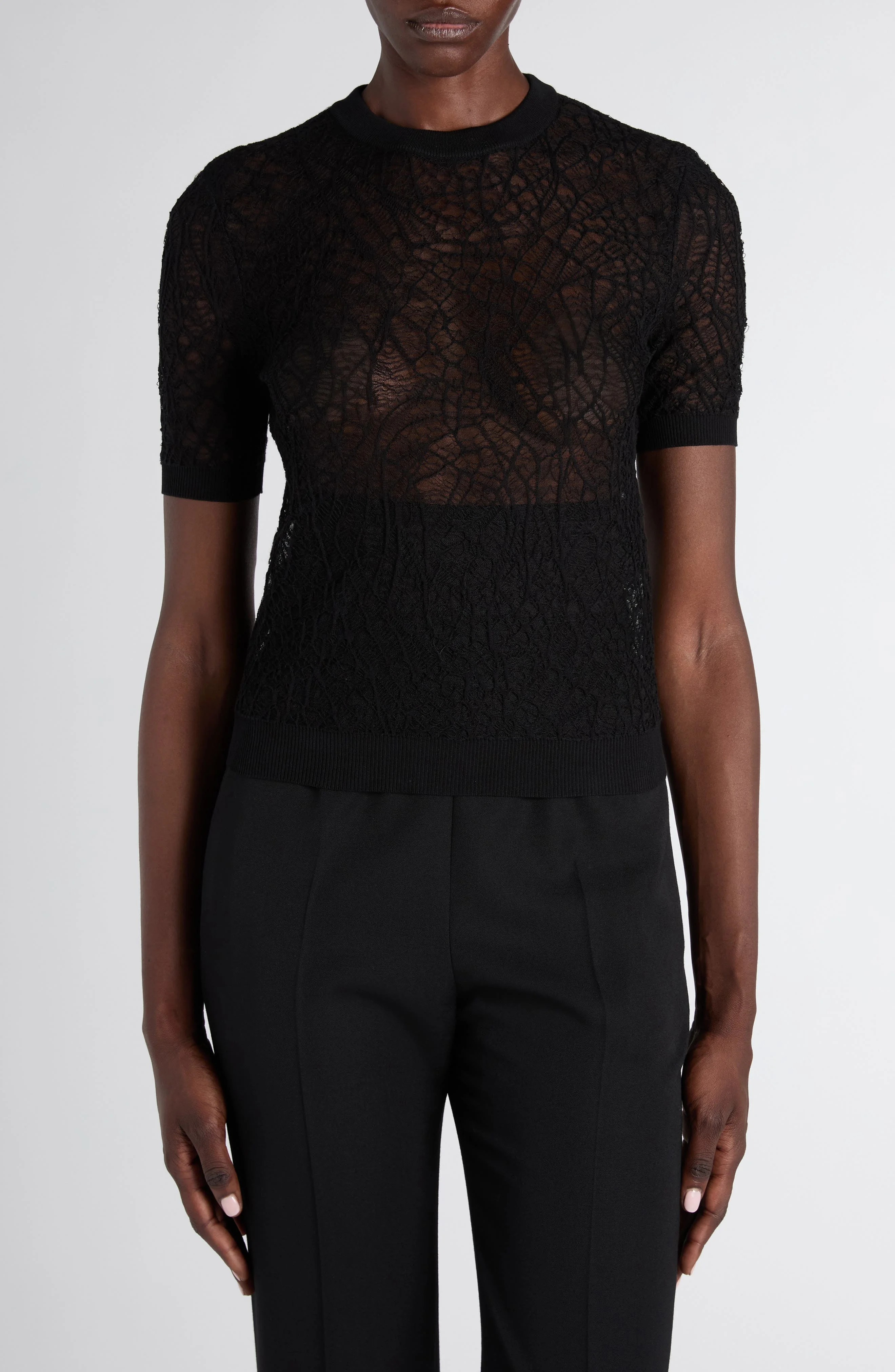 A lacy, semisheer jacquard resembles spidery cobwebs for a bit of McQueen edge on this short-sleeve sweater knit from a soft cotton and silk yarn. Crewneck Short sleeves Ribbed cuffs and hem 54% cotton, 46% silk Dry clean Made in Italy Designer Clothing