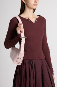 Sculptural bar hardware brings this season's signature look to an asymmetric crossbody pouch shaped from richly crackled calfskin. Top zip closure Adjustable strap Interior card slot Suede lining Leather Made in Italy Designer Handbags