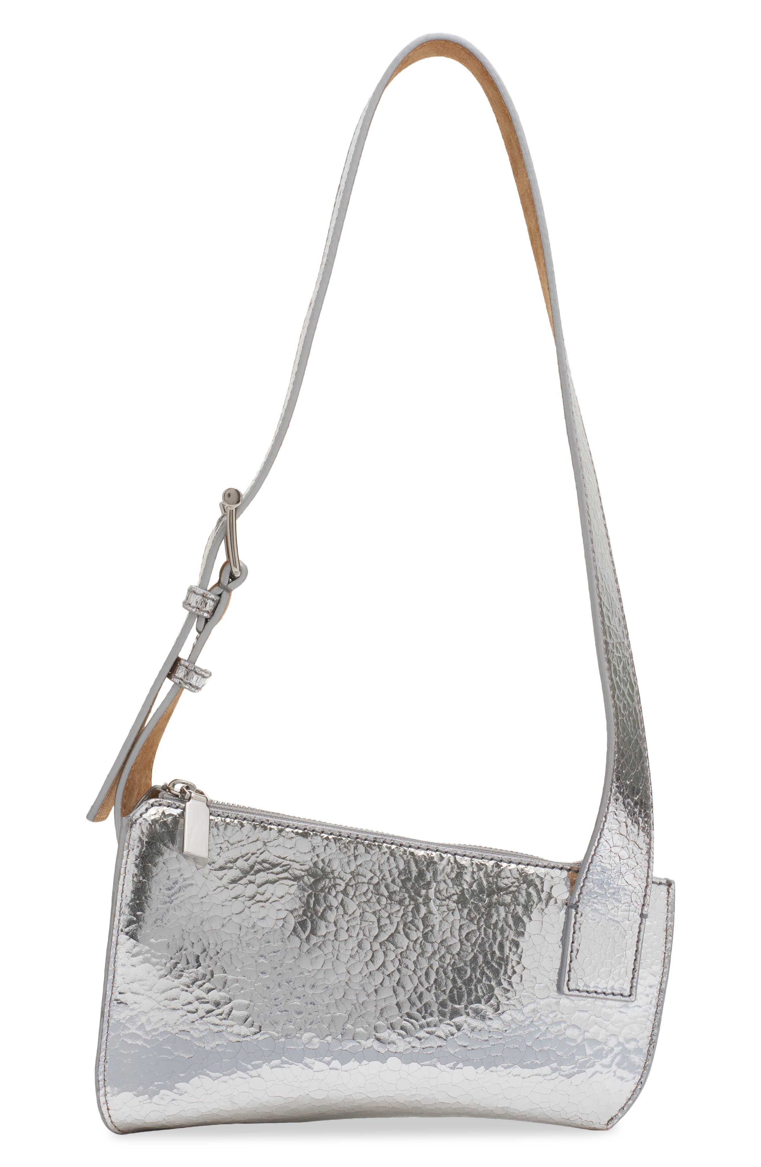 Sculptural bar hardware brings this season's signature look to an asymmetric crossbody pouch shaped from richly pebbled metallic calfskin. Top zip closure Adjustable strap Interior card slot Suede lining Leather Made in Italy Designer Handbags