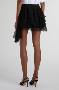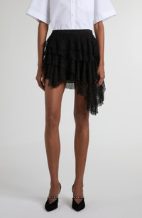 In true McQueen tradition, Sean McGirr marries grunge and glamour to attention-getting effect in this asymmetric miniskirt shaped from flouncy tiers of web-like lace. Hidden side-zip closure Nylon/cotton Made in Italy Dry clean Designer Clothing