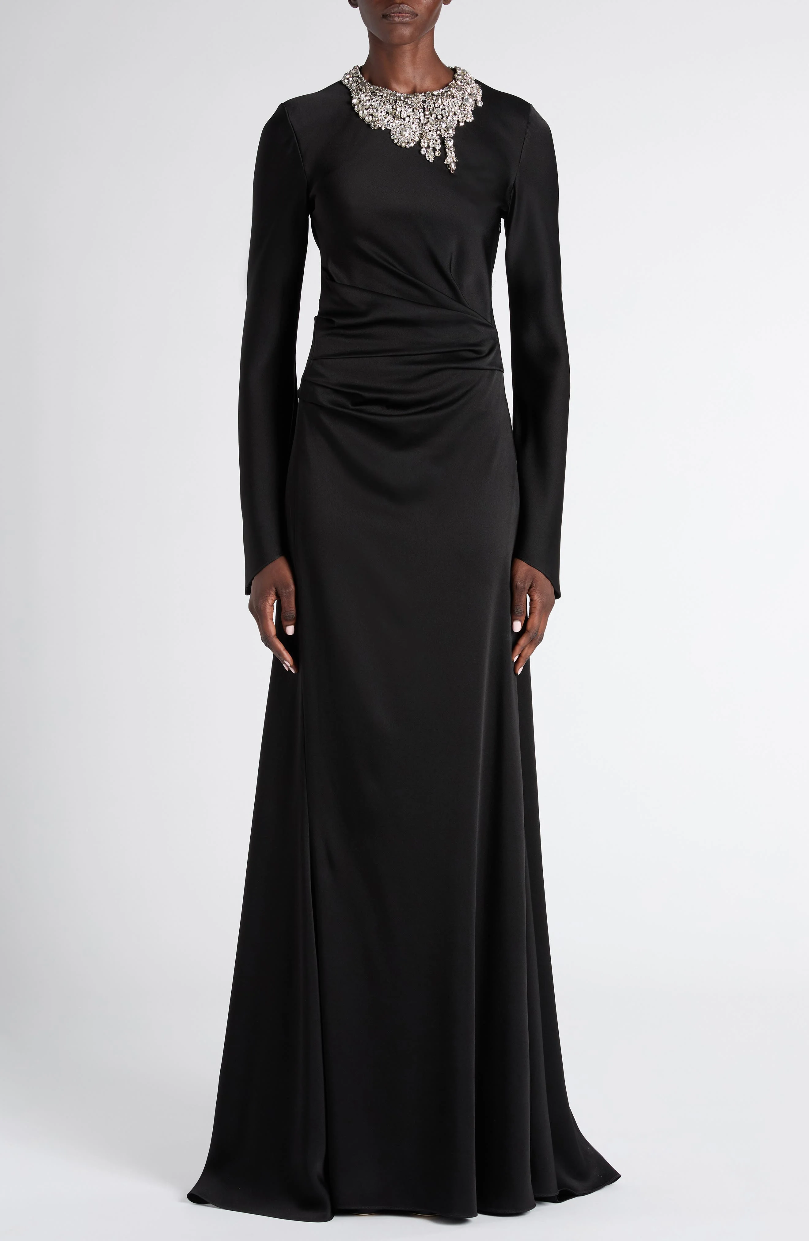 Dazzling crystal embellishment drips from the jewel neckline of this dramatic gown fashioned with a ruched waist and long sleeves cut with angled, bell-shaped cuffs. Back keyhole with button-and-loop closure Jewel neck Long sleeves 52% viscose, 48% acetate Dry clean Made in Italy Designer Clothing
