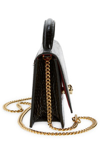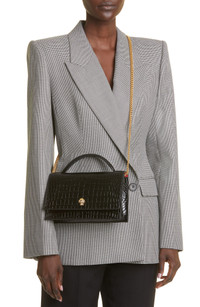 A grinning skull with twinkling crystal eyes adds signature gothic charm to a croc-embossed bag that can be carried in hand or with its gleaming chain strap. Magnetic-snap flap closure Top carry handle; drop-in chain strap Interior card slot Structured silhouette with level base for stability Leather Made in Italy Designer Handbags