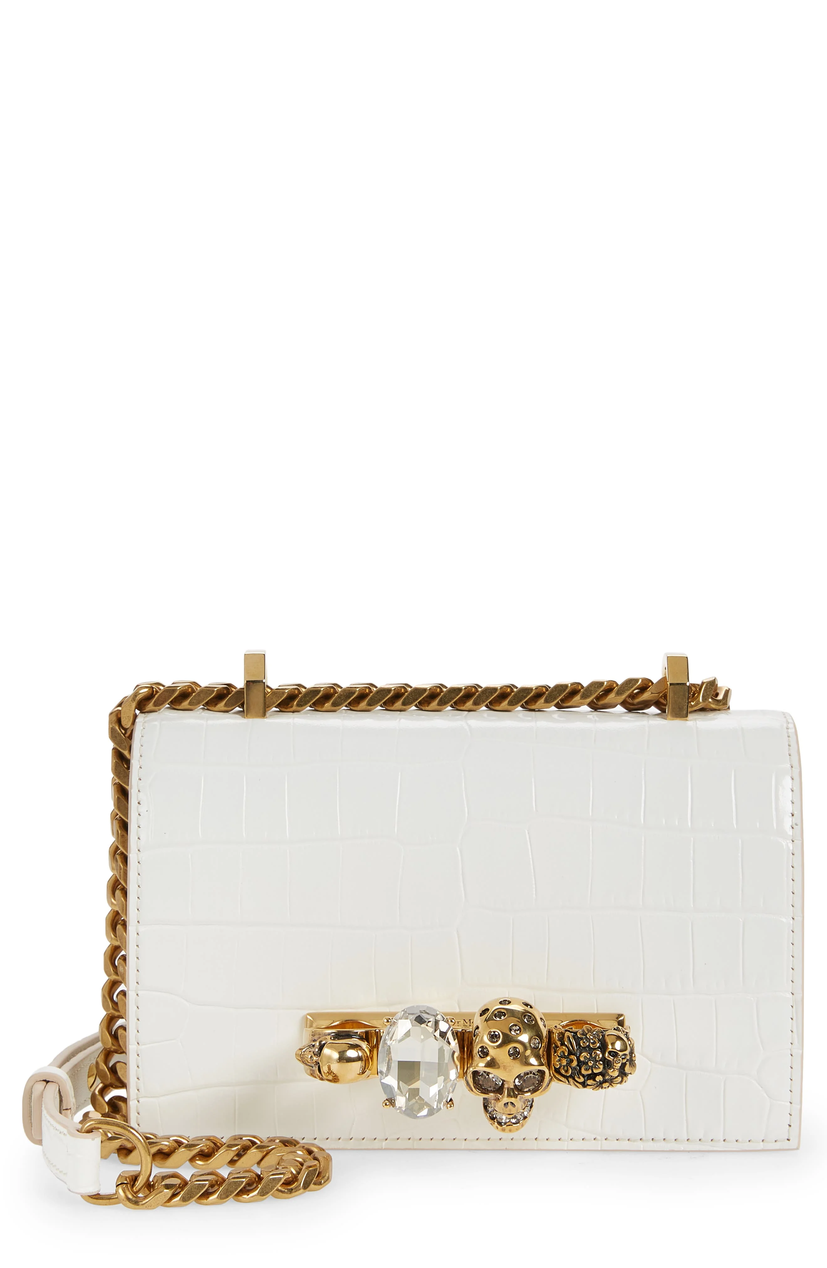 Knuckle-ring hardware with a Swarovski crystal-encrusted skull provides an edgy carrying option for this croc-embossed calfskin bag. For more styling versatility, the adjustable pull-through chain strap can be worn doubled or extended as you prefer. 7"W x 4"H x 2"D Magnetic-snap flap closure Ring carry handle; adjustable pull-through chain-and-leather strap Interior card slot Suede lining Leather Made in Italy Designer Handbags