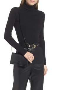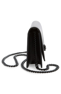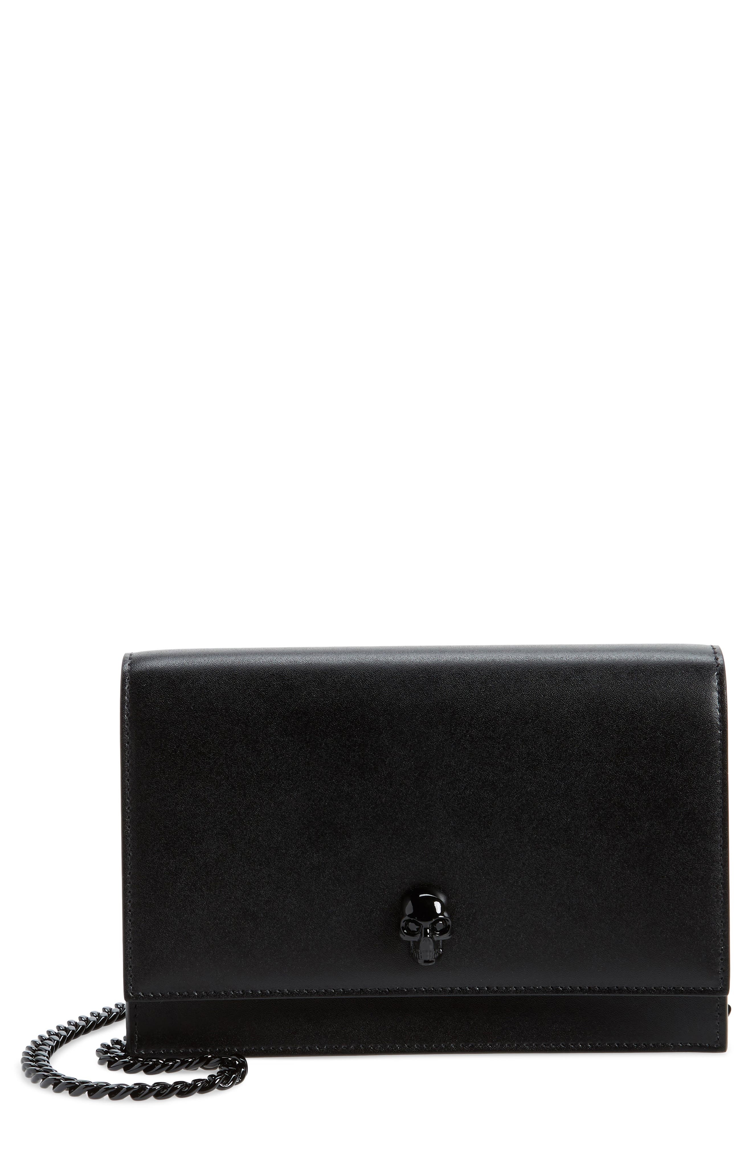 A grinning crystal-eyed skull at the flap gives a touch of Gothic edge to a structured calfskin bag suspended from a gleaming chain strap. Magnetic-snap flap closure Chain shoulder strap Calfskin leather Made in Italy Designer Handbags