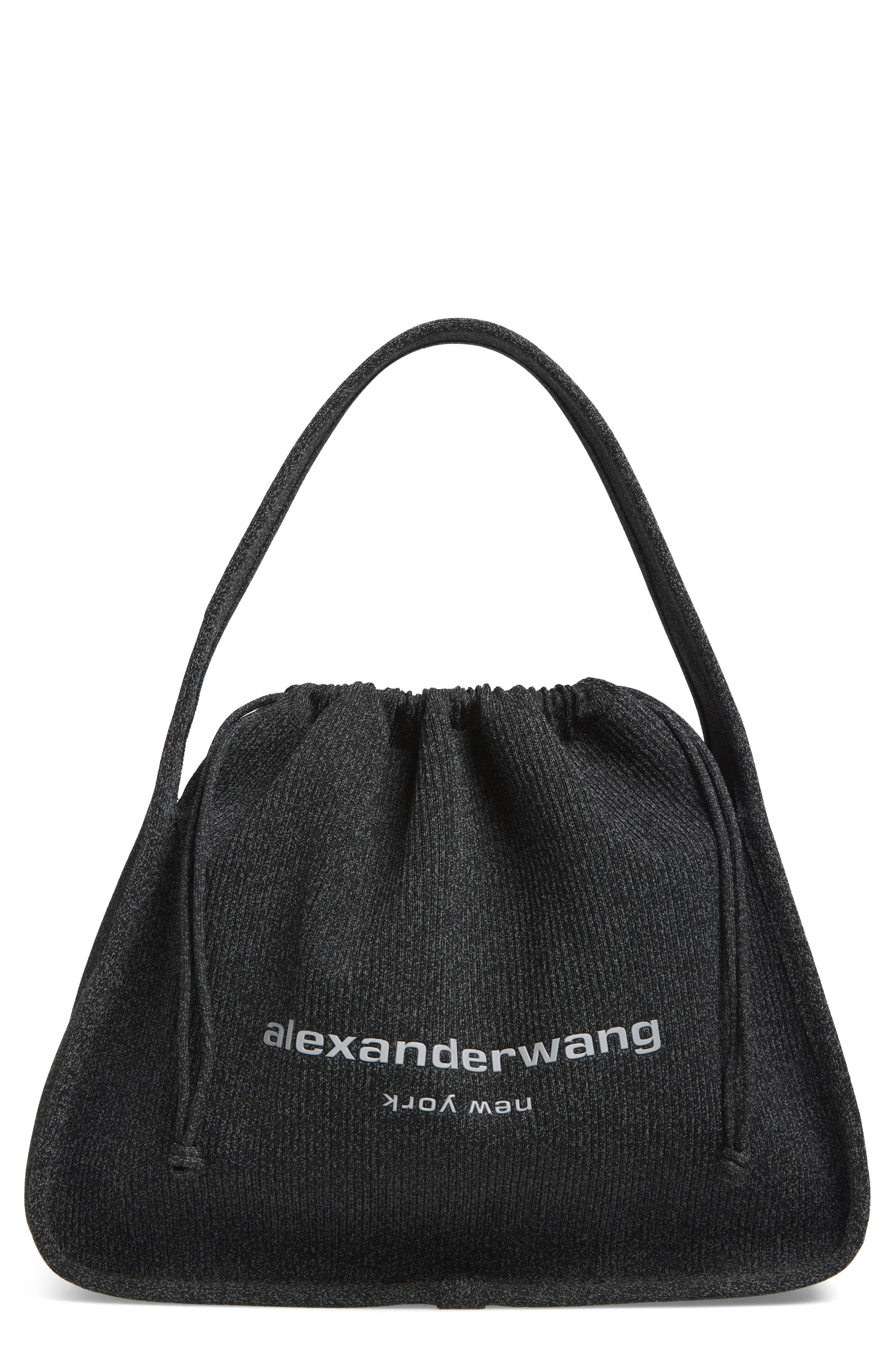 Alexander Wang draws inspiration from the soft drawstring-shut silhouette of dust bags with this ribbed shoulder bag emblazoned with glossy logo lettering. Drawstring closure Shoulder strap Textile Imported Designer Handbags