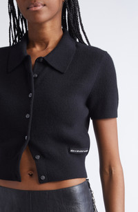 Alexander Wang Logo Short Sleeve Wool Crop Cardigan in Black at Nordstrom