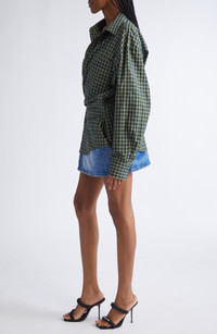 A traditional check merges with faded denim on this mixed-media minidress that's swept to the side and secured with a tack button. True wrap style with button closures Spread collar Long sleeves with button cuffs Chest patch pocket; side-seam pockets 100% cotton Dry clean Imported Designer Clothing