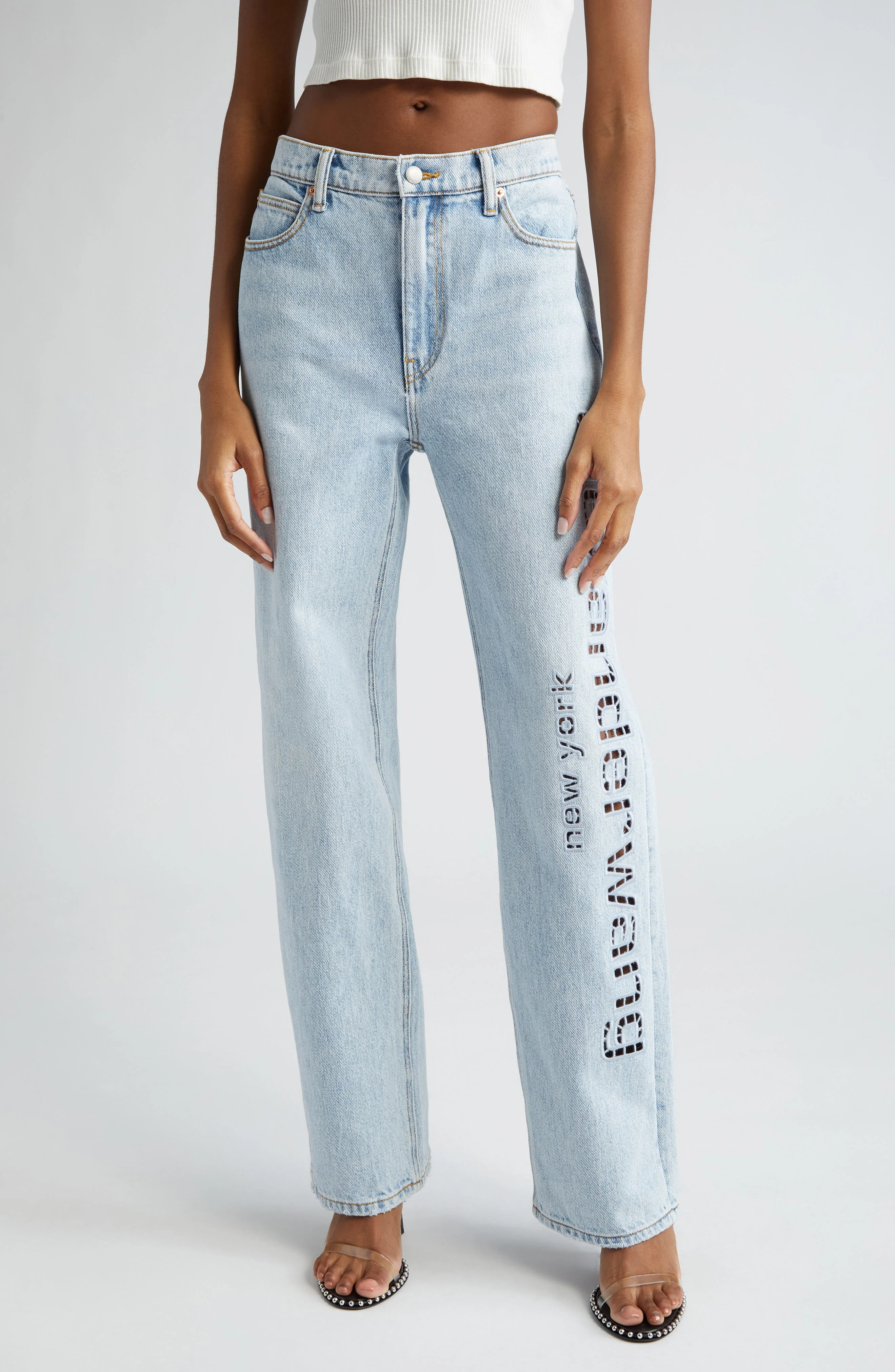 Bleached-out mid-rise jeans with a straight leg and slouchy fit feature cutout logo embroidery extending down one leg for a touch of bold branding. 32 1/2" inseam; 18" leg opening; 11" front rise; 14" back rise (size 26) Zip fly with button closure Five-pocket style 65% cotton, 29% polyamide, 6% elastane Machine wash, line dry Imported Designer Clothing
