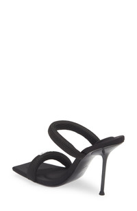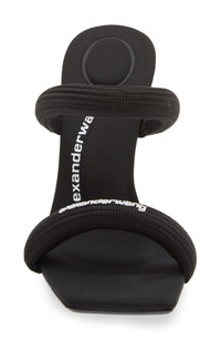 Contrast logo letters pop on the tubular webbed straps of this square-toe stiletto sandal that deftly combines sport, leisure and glamour. A custom hi-frequency molded footbed features strategically placed cushioned pads for lasting comfort. 4 1/8" heel, 104mm (size 8.5) Comfort-molded cushioned footbed Textile upper/synthetic lining/leather sole Imported Women's Designer Shoes