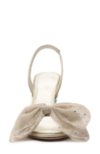 An oversized tulle bow embellished with sparkling crystals makes this metallic-leather slingback sandal perfect for the playful, modern bride. The label's signature flared stiletto heel provides a little more stability, taking you comfortably from walking down the aisle to the last dance. 3 1/4" (85mm) heel Elasticized slingback strap Leather and textile upper/leather lining and sole Made in Brazil Designer Shoes