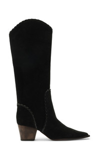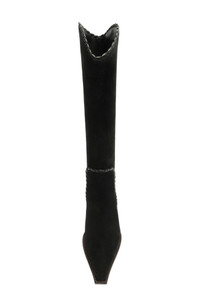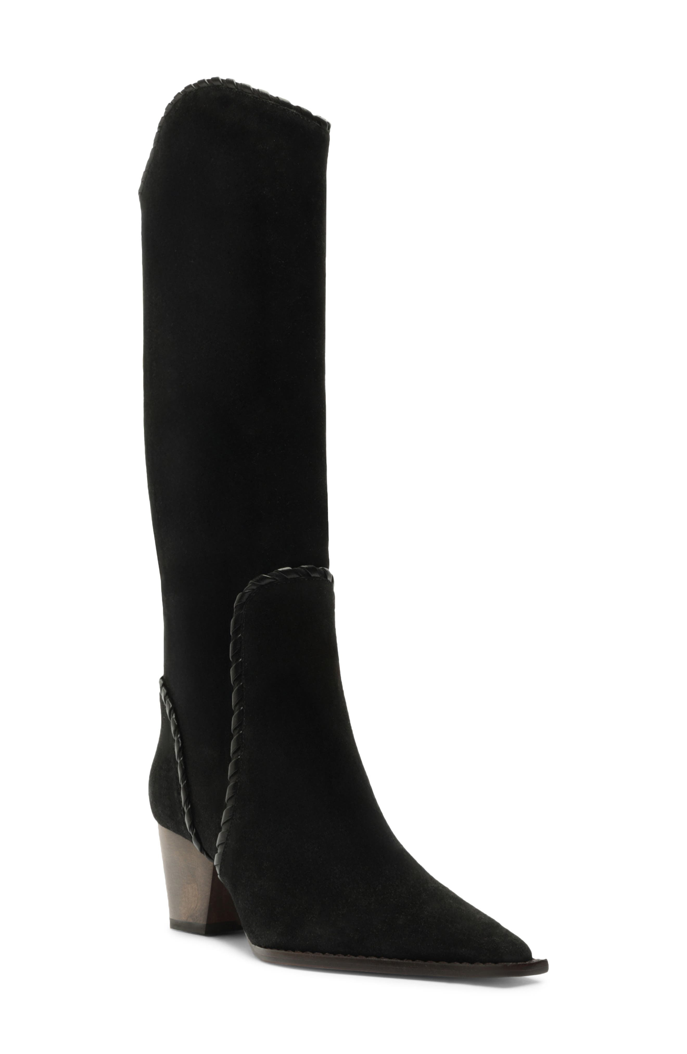 Equestrian influences define knee-high boot shaped from velvety suede with an elongated-square toe, curved topline and richly textured trim. A wooden block heel firmly grounds this Western-inspired style into the contemporary moment. 2 1/4" (60mm) heel (size 37) Pull-on style Leather upper, lining and sole Made in Brazil Designer Shoes