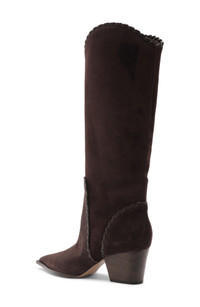 Equestrian influences define knee-high boot shaped from velvety suede with an elongated-square toe, curved topline and richly textured trim. A wooden block heel firmly grounds this Western-inspired style into the contemporary moment. 2 1/4" (60mm) heel (size 37) Pull-on style Leather upper, lining and sole Made in Brazil Designer Shoes