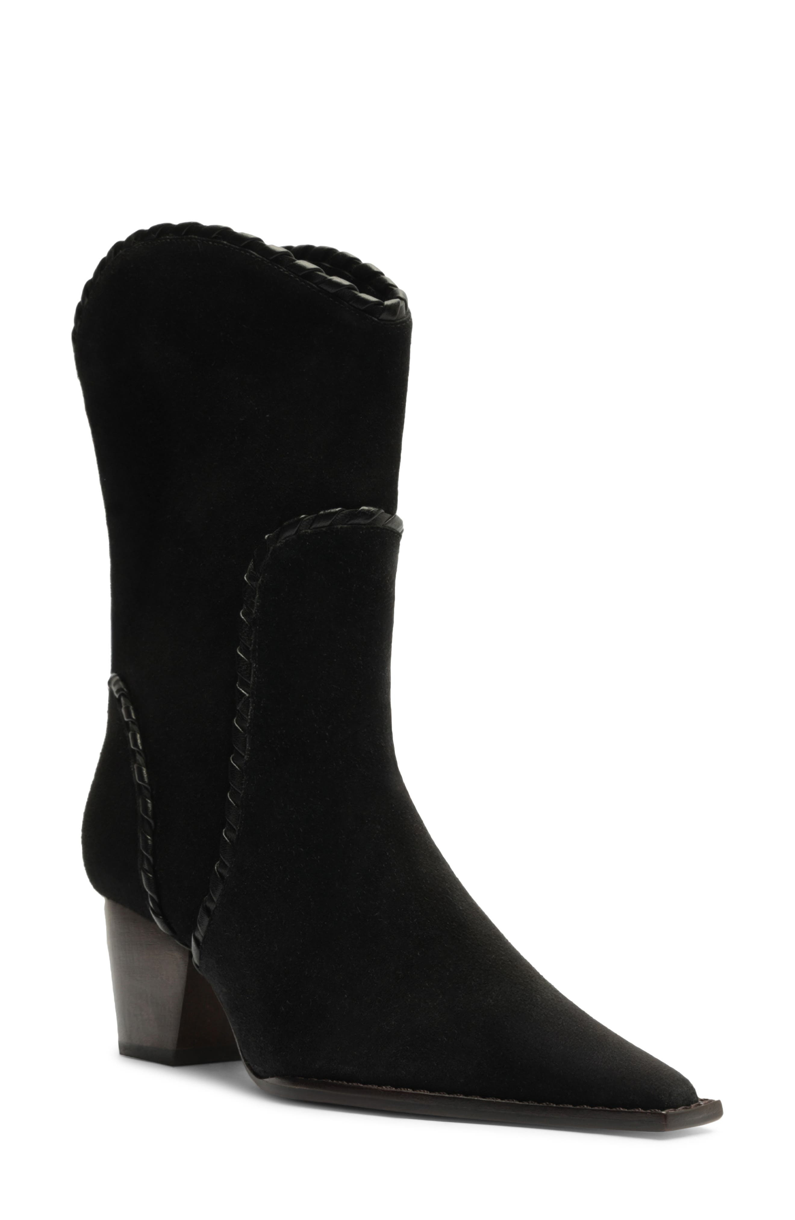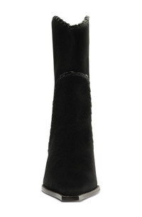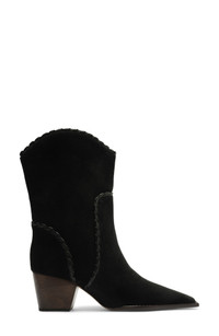 Equestrian influences define a square-toe boot shaped from velvety suede with a curved topline and richly textured trim. A wooden block heel firmly grounds this Western-inspired style into the contemporary moment. 2 1/4" (60mm) heel (size 37) Pull-on style Leather upper, lining and sole Made in Brazil Designer Shoes