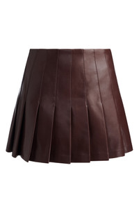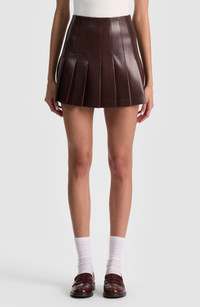 Classic school-day prep and edgy style collide in this faux-leather miniskirt made in a flared silhouette with crisp pleats. Exposed back-zip closure Lined 100% polyester with polyurethane coating Dry clean Imported