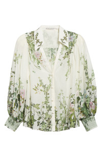 A garden of blooms adds enchantment to this blousy silk-enriched top framed by smocked cuffs. Front button closure Spread collar Long sleeves with smocked cuffs 70% cotton, 30% silk Dry clean Imported
