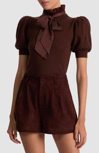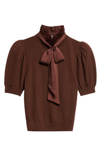 A satin ruffled stand collar with a drapey tie puts extra polish on this puff-sleeve stretch-wool sweater, taking the look to peak-level adorable. 21" length (size Medium) Exposed back-zip closure Mock neck with removable ties; back hook-and-eye closure Short sleeves Ribbed cuffs and hem 96% wool, 4% elastane with 97% cotton, 3% elastane and 91% silk, 9% elastane combos Dry clean Imported Women's Clothing