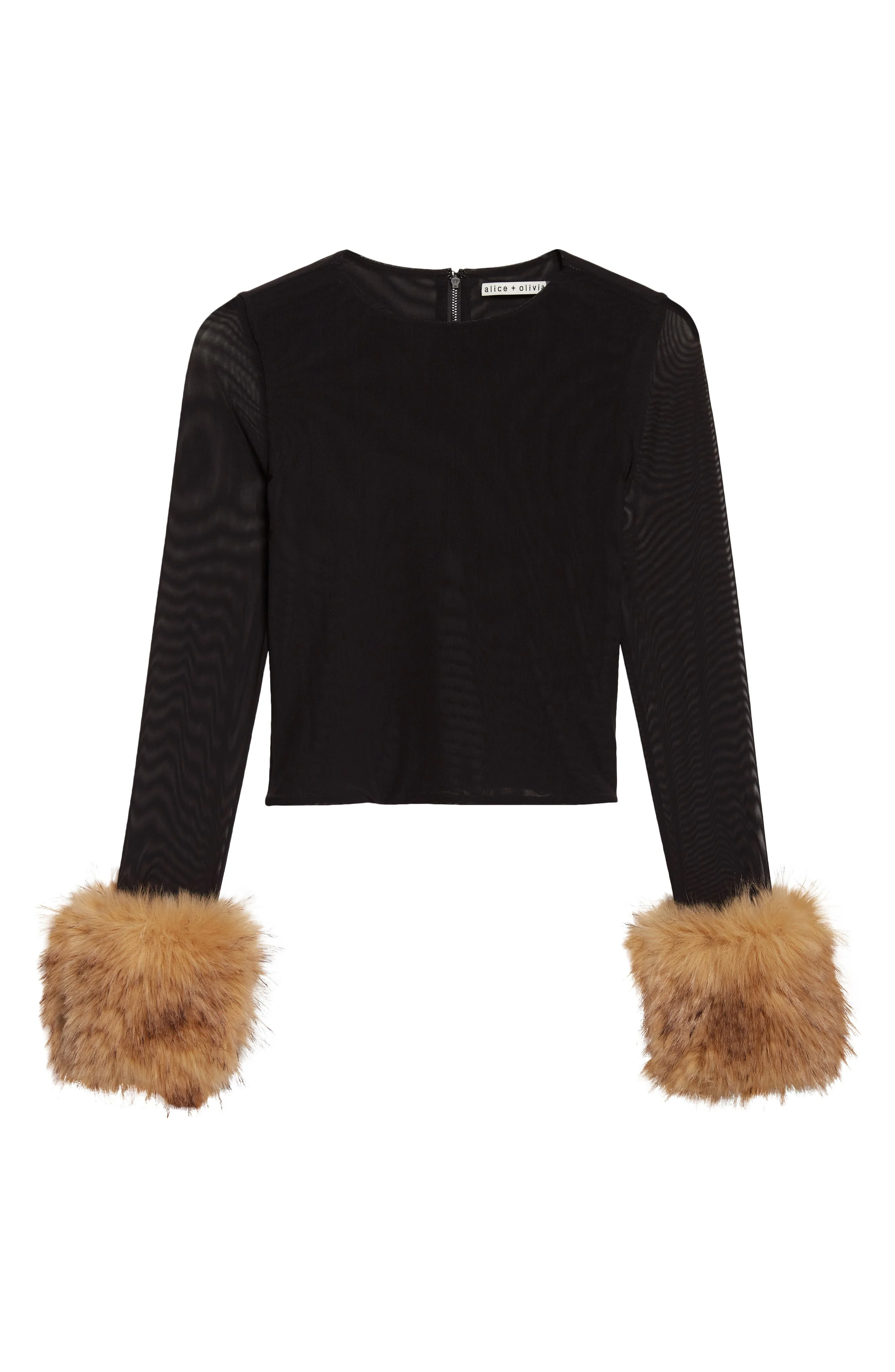Alice + Olivia Delaina Faux Fur Cuff Mesh Crop Top in Black at Nordstrom