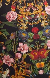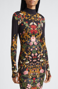 A garden of vibrant blooms patterns this stretchy body-con dress, creating a statement look that hugs your curves in all the right places. Slips on over head Mock neck Long sleeves with thumbhole cuffs 97% viscose, 3% elastane Dry clean Imported