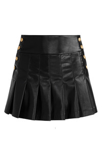 Catch compliments on your next night out in this pleated miniskirt fashioned from sleek faux leather and glossy goldtone buttons. 100% polyurethane Dry clean Imported
