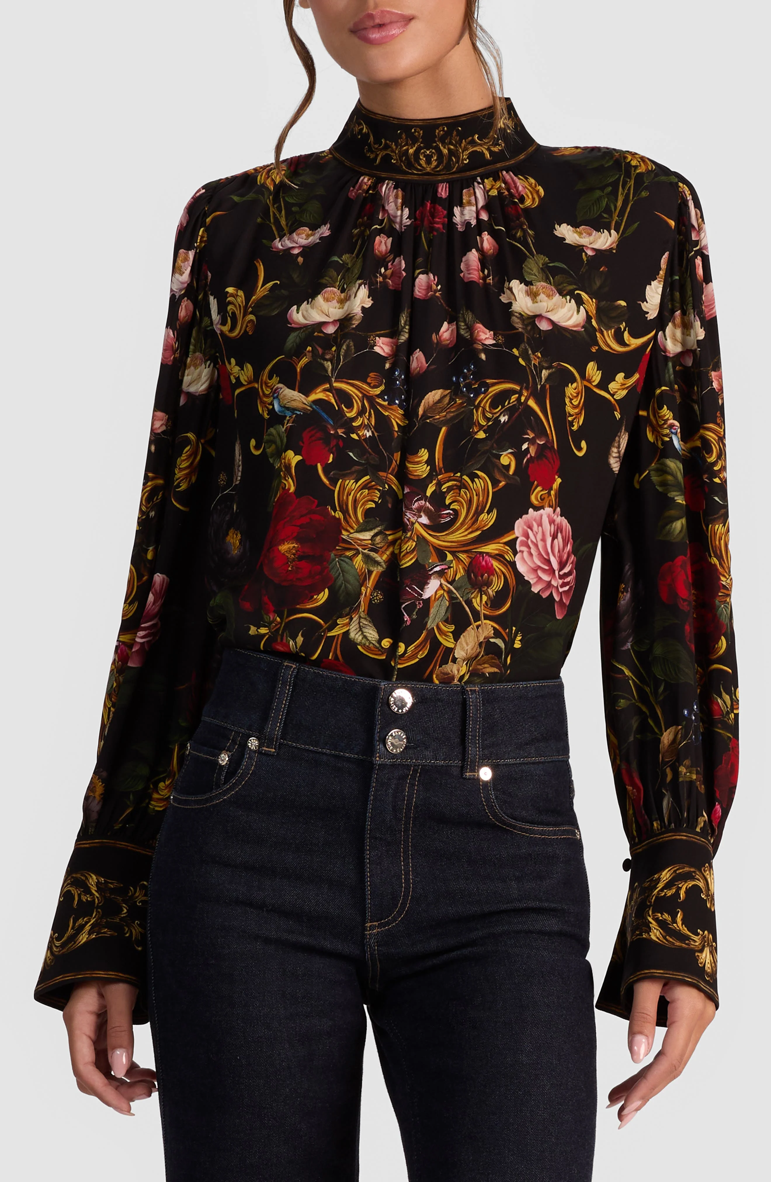 Refined yet expressive, this mock-neck blouse featuring a baroque floral motif brings artful detail into everyday style. The pleated front panel provides graceful texture, while balloon sleeves and flared cuffs lend subtle drama. Back keyhole with button-and-loop closure Mock neck Long sleeves with flared one-button cuffs 98% wool, 2% elastane Dry clean Imported