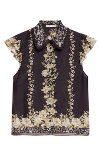 Perfect for any garden-lover, this cotton-and-silk button-up top is planted with neat rows of flowers and framed by a ruffled collar and fluttery cap sleves. Front button closure Spread collar Cap sleeves 70% cotton, 30% silk Dry clean Imported