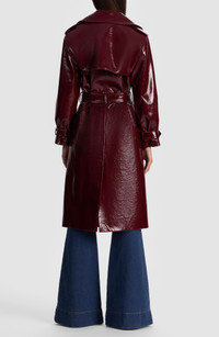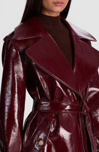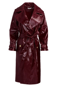 Support your fashion mission with a classically cut trench turned out in a high-shine faux leather fabrication and painted in a wine-soaked shade. Double-breasted button closure Notched lapels Belted cuffs Front button-flap pockets Removable sash Lined 100% polyester with polyurethane coating Dry clean Imported