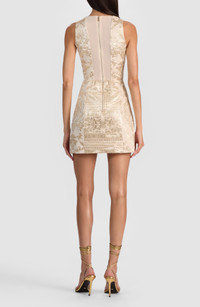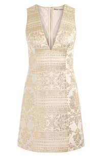 Get the party started in this leggy minidress made from ornate metallic jacquard that's the perfect balance to the sultry, curve-skimming A-line silhouette and plunging neckline. 33" length (size 8) Exposed back-zip closure Plunge neck Sleeveless Lined 78% viscose, 22% polyester Dry clean Imported