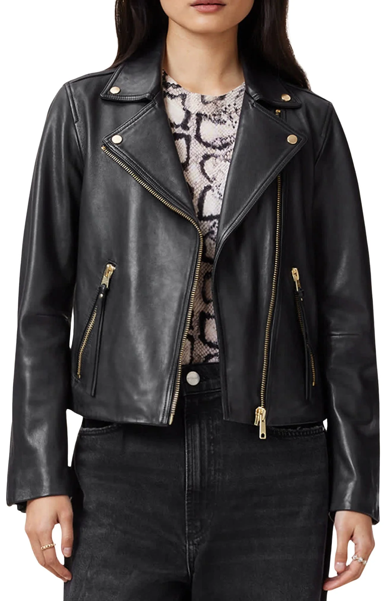 AllSaints Dalby Leather Biker Jacket in Black/Gold at Nordstrom