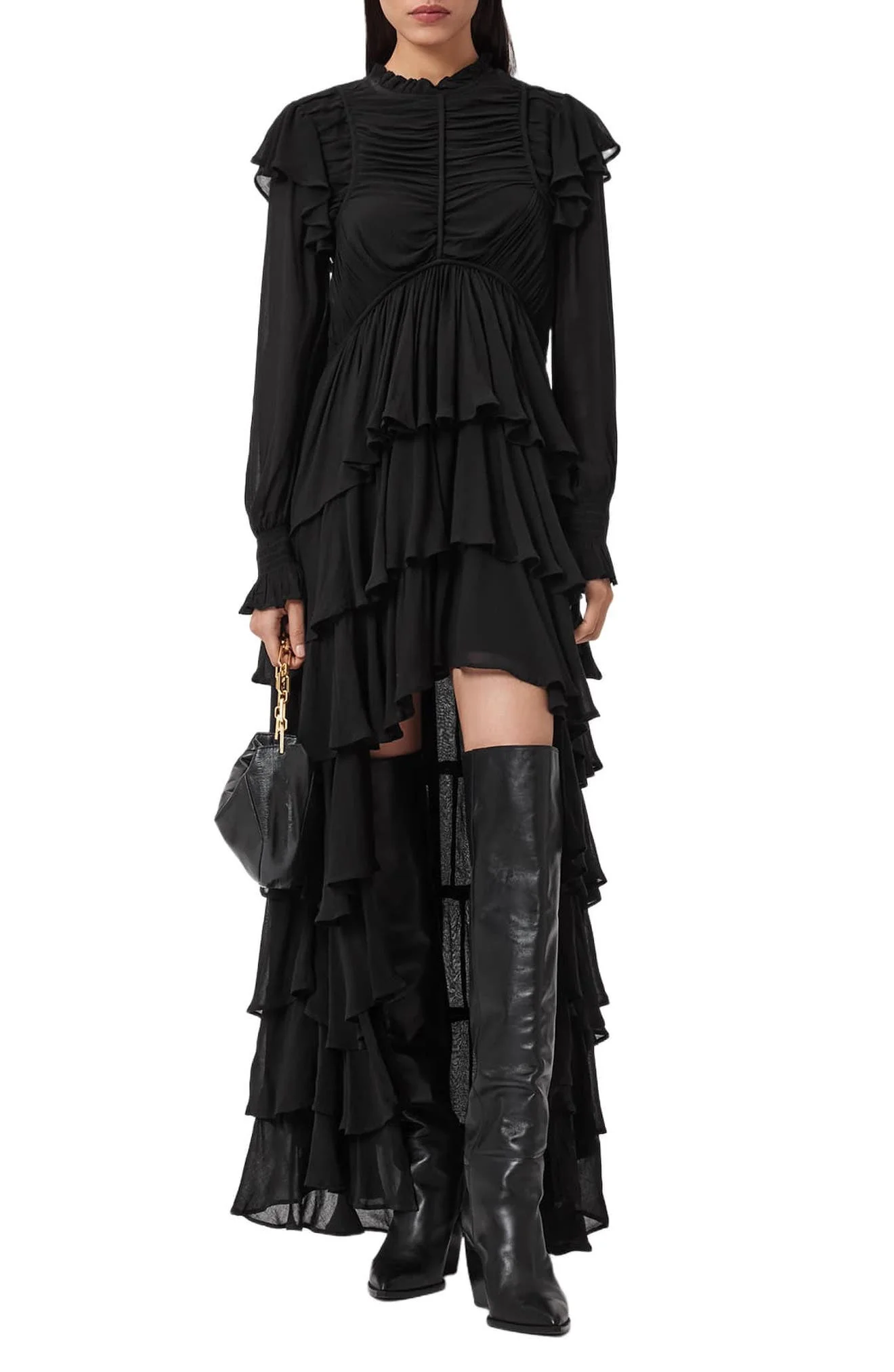 AllSaints Leila Layered Ruffle Long Sleeve High-Low Maxi Dress in Black at Nordstrom